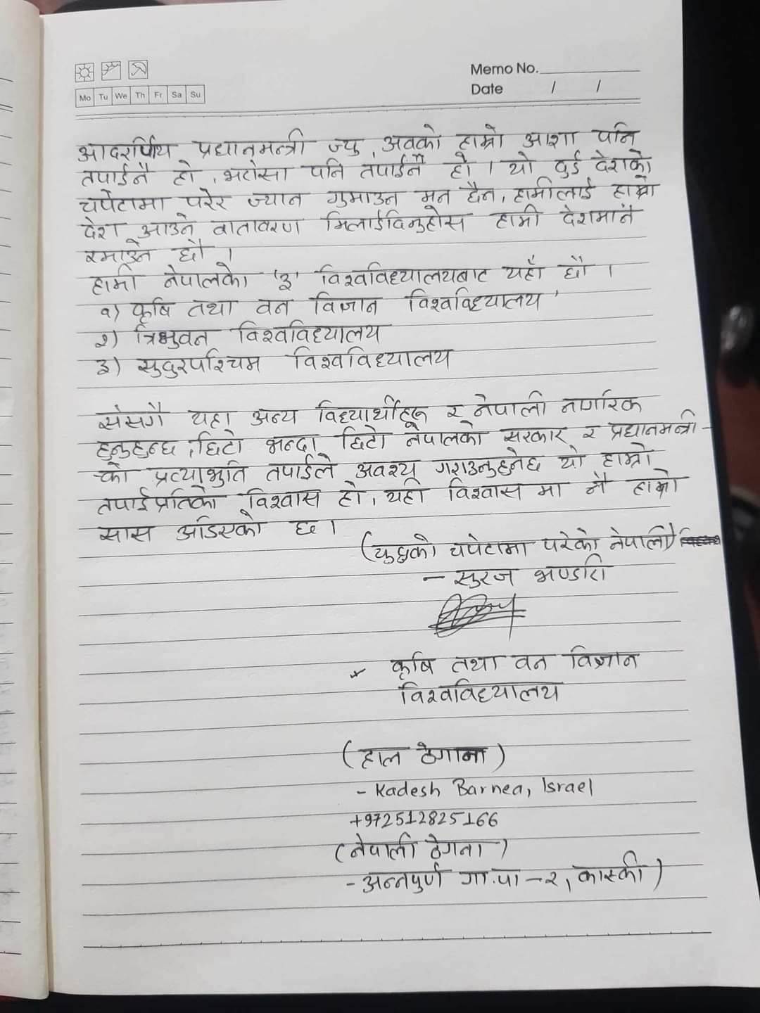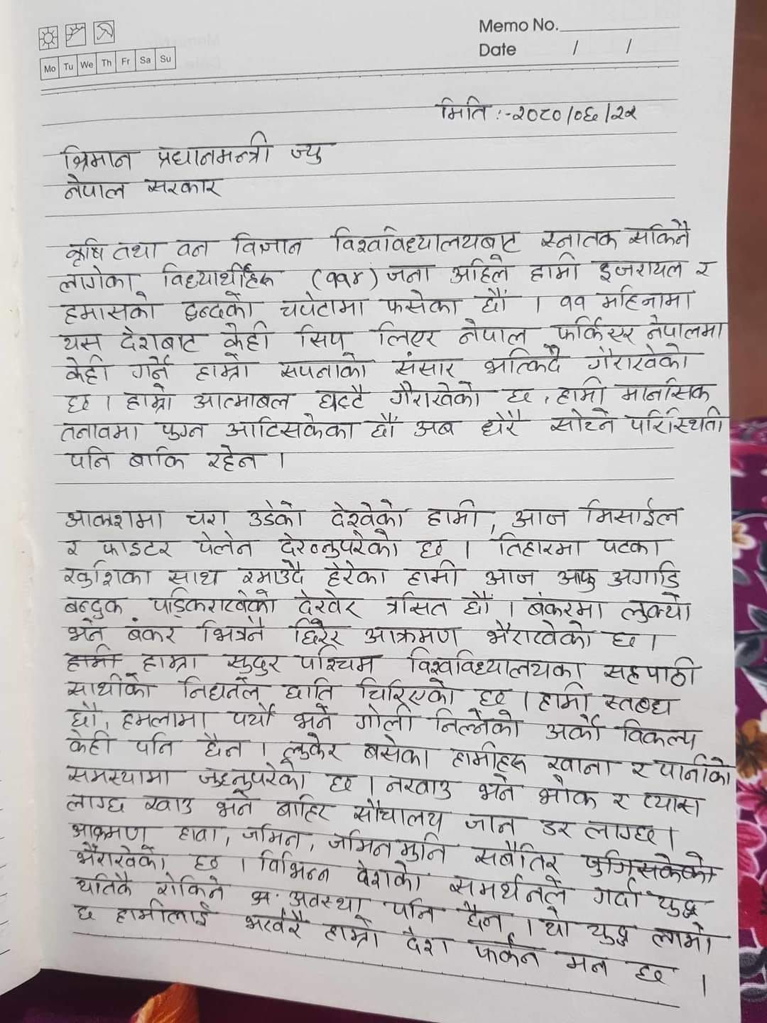 ‘कृषि तथा वन विज्ञान विश्वविद्यालयबाट स्नातक सकिने लागेका विध्यार्थीहरु (११४) जना अहिले हामी इजरायल र हमासको इन्दको चपेटामा फसेका छौँ । ११ महिनामा यस देशबाट केही सिप लिएर नेपाल फर्किएर नेपालमा केही गर्ने हाम्रो सपनाको संसार भत्किदै गइराखेको छ । हाम्रो आत्माबल घट्दै गइराखेको छ, हामी मानसिक तनावमा पुग्न आँटिसकेका छौं अब धेरै सोच्ने परिस्थिति पनि बाँकी रहेन ।’