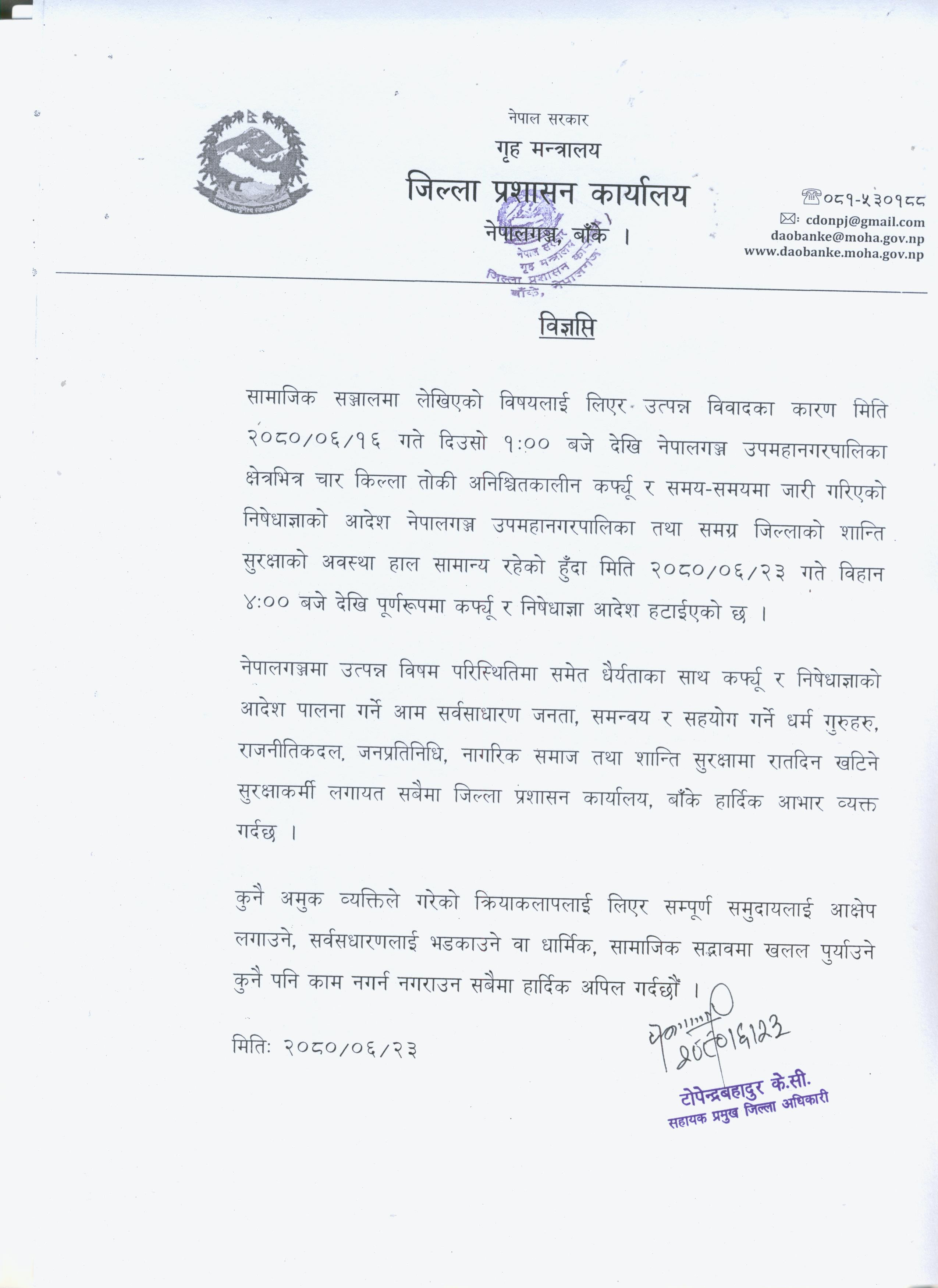 सहायक प्रमुख जिल्ला अधिकारी टोपेन्द्रबहादुर केसीले एक सूचना जारी गर्दै मंगलबार बिहान ४ बजेदेखि कर्फ्यु र निषेधाज्ञा पूर्ण रूपमा हटाइएको उल्लेख गरेका हुन् ।