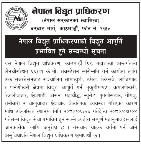 प्राधिकरणको काठमाडौं ग्रिड महाशाखाअन्तर्गत लैनचौरस्थित ६६ र ११ के.भी.सबस्टेसन स्तरोन्नति भइरहेकाले कात्तिक ४ गतेसम्म उक्त सबस्टेशनबाट आपूर्ति भइरहेका स्थानसहित अन्य क्षेत्रमा विद्युत् सेवा प्रभावित हुने प्राधिकरणकाे भनाइ छ ।