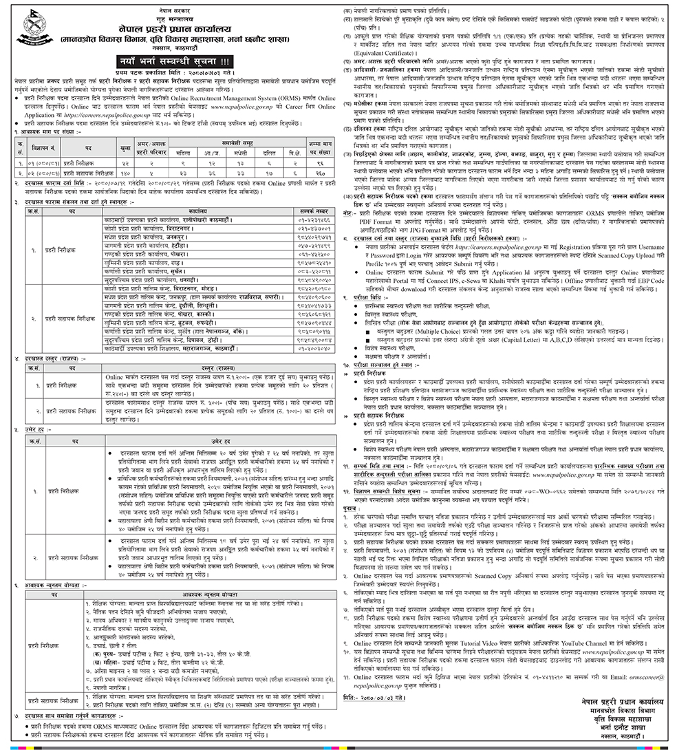 दरखास्त फारम दर्ता मिति कात्तिक १९ गतेदेखि मंसिर २९ गतेसम्म तोकिएको छ । इन्स्पेक्टरको हकमा अनलाइनमार्फत् र असईको हकमा सार्वजनिक बिदाको दिनबाहेक कार्यालय समयभित्र दरखास्त दिन सकिने प्रहरी प्रधान कार्यालय नक्सालले आज निकालेको सूचनामा उल्लेख छ ।