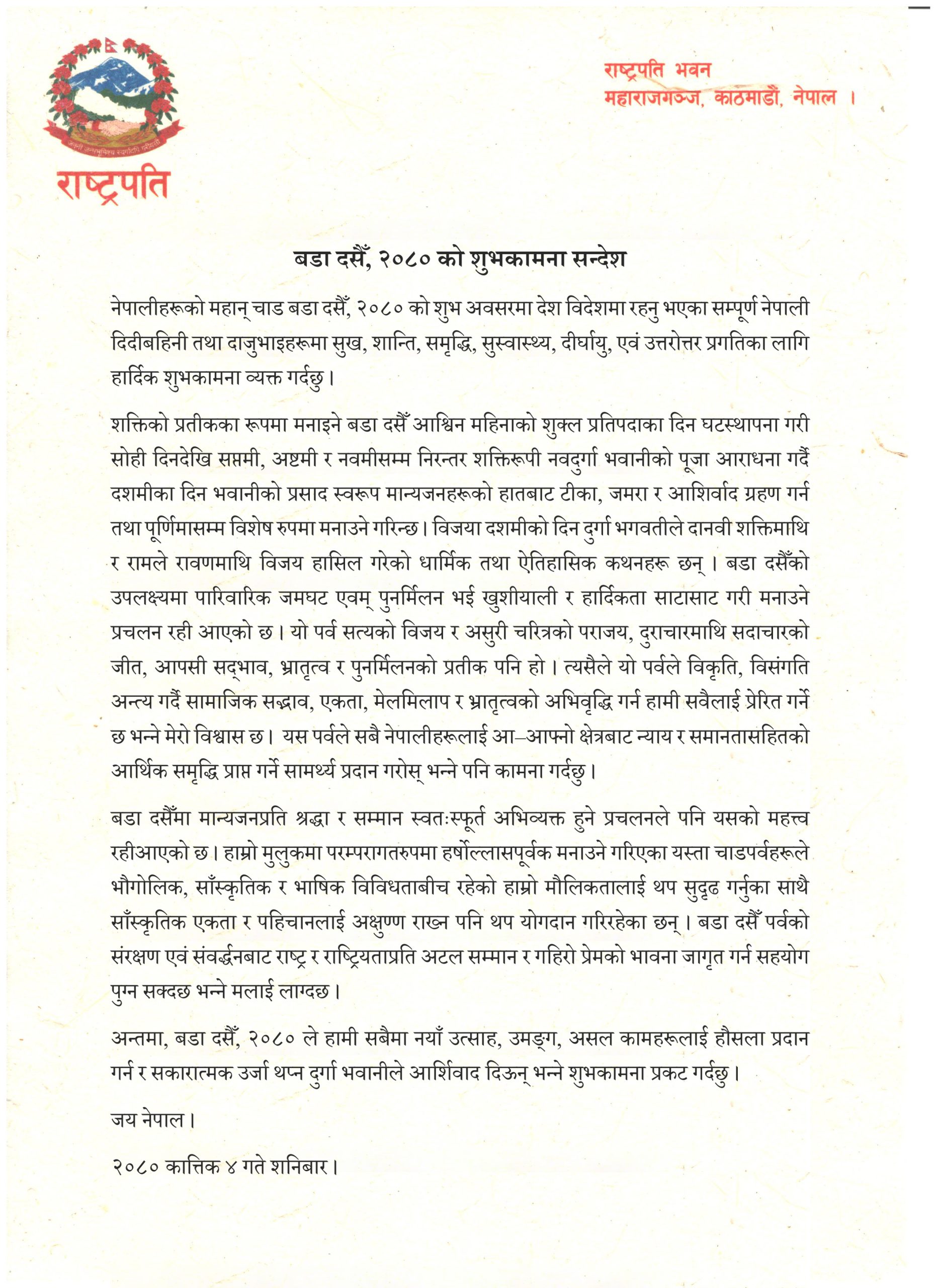 नेपालीहरूको महान पर्व दसैँको शुभकामना दिँदै शनिबार जारी वक्तव्यमा राष्ट्रपतिले यो पर्वले विकृति, विसंगति अन्त्य गर्दै सामाजिक सद्भाव, एकता, मेलमिलाप र भ्रातृत्वको अभिवृद्धि गर्न सबैलाई प्रेरित गरोस् भनेका छन् ।