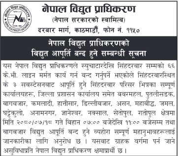 प्राधिकरणले स्युचाटारदेखि सिंहदरबारसम्मको ६६ केभी प्रसारण लाइन मर्मत गर्नुपर्ने भएकोले सिंहदरबारस्थित के ३ सबस्टेसनबाट आपूर्ति हुने सिंहदरबार परिसरका सम्पूर्ण कार्यालयहरू, जिल्ला प्रशासन कार्यालय समेत बबरमहल, पुतलीसडक, बागबजार, कमलादी, हात्तीसार, डिल्लीबजार, असन, महाबौद्ध, जमल, घट्टेकुलो, अनामनगर, ज्ञानेश्वर, नक्साल, सेतोपुल, रातोपुल क्षेत्रमा भोलि बिहान विद्युत् आपूर्ति प्रभावित हुने जानकारी दिएको छ ।
