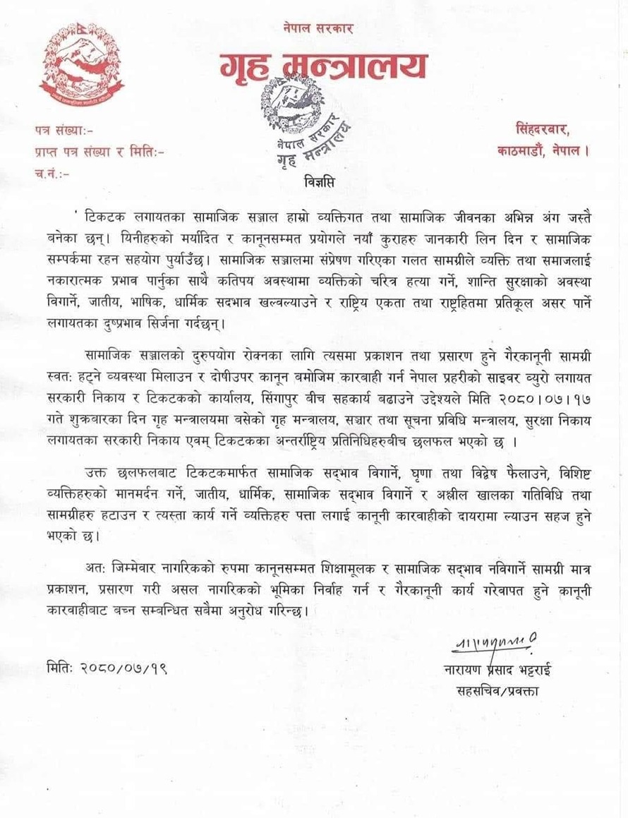 टिकटक लगायतका सामाजिक सञ्जालको मर्यादित र कानुनसम्मत प्रयोगले नयाँ कुराहरू जानकारी लिन दिन र सामाजिक सम्पर्कमा रहन सहयोग पुर्याउने भन्दै गृह मन्त्रालयले गलत सामग्रीले व्यक्ति तथा समाजलाई नकारात्मक प्रभाव पर्ने, व्यक्तिको चरित्र हत्या गर्ने, शान्ति सुरक्षाको अवस्था बिगार्ने, जातीय, भाषिक, धार्मिक सदभाव खल्बल्याउने र राष्ट्रिय एकता तथा राष्ट्रहितमा प्रतिकूल असर पार्ने लगायतका दुष्प्रभाव सिर्जना गर्नेतर्फ सचेत गराएको छ ।