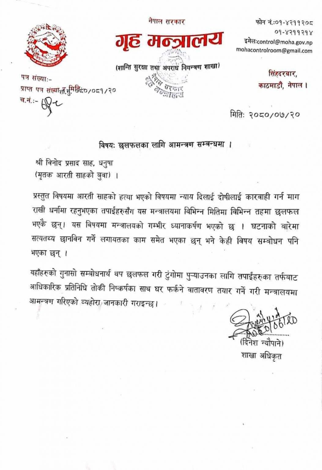गृहले प्रहरी प्रधान कार्यालय धनुषाका प्रहरी प्रमुख विश्वराज खड्कालाई फिर्ता बोलाएर साहका आफन्तलाई वार्तामा बोलाएको हो । आरतीका बुबा विनोदप्रसाद साहलाई सम्बोधन गर्दै वार्ताका लागि प्रतिनिधि पठाउन गृहले सोमबार पीडित पक्षलाई पत्राचार गरेको छ ।