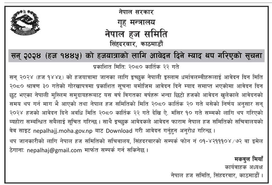 काठमाडौं— नेपाल हज समितिले सन् २०२४ को हज यात्राका लागि आवेदन दिने म्याद थप गरेको छ । नेपाल हज समितिका कार्यवाहक अध्यक्ष मकवुल मियाँका अनुसार हज यात्राका लागि आवेदन दिने म्याद मंसिर १० गतेसम्म थप गरिएको छ ।