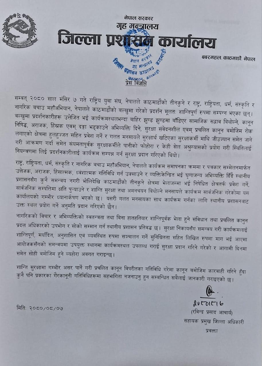 काठमाडौं प्रशासनका सहायक प्रमुख जिल्ला अधिकारी रविन्द्रप्रसाद आचार्यद्वारा जारी विज्ञप्तिमा उत्तेजक, अराजक, हिंसात्मक, ध्वंशात्मक गतिविधि गर्न उक्साउने र व्यक्ति केन्द्रित भई घृणाजन्य अभिव्यक्ति दिँदै सार्वजनिक सम्पत्तिमा क्षति पुर्याउने र शान्ति सुरक्षा तथा अमनचयन बिथोल्ने मनसायले कार्यक्रम सार्वजनिक गरेको भन्दै शान्ति सुरक्षामा गम्भीर असर पार्ने गरी प्रचलित कानुन विपरीतका गतिविधि गरेमा कानुनबमोजिम कारबाही गर्ने चेतावनी दिइएको छ ।