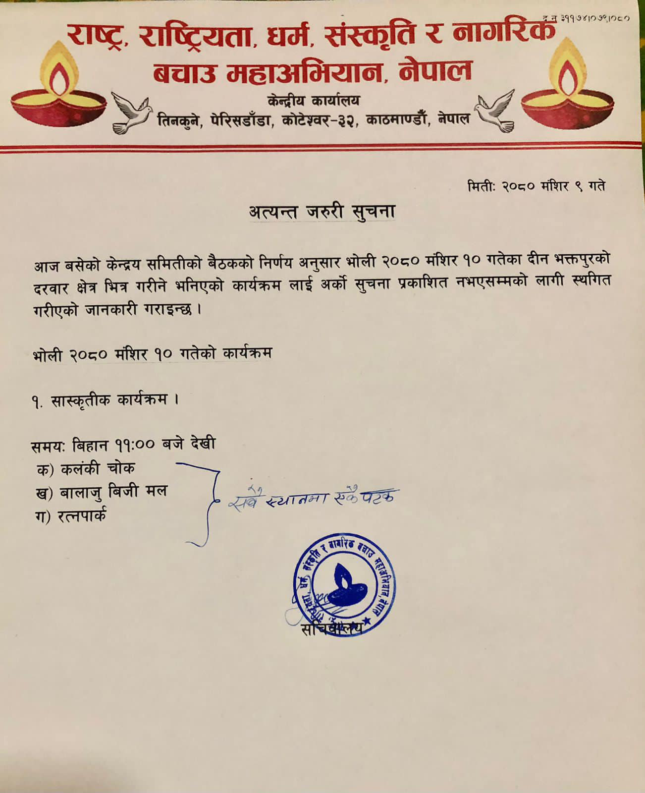 आइतबार भने भक्तपुरको दरबार क्षेत्रमा तय भएको कार्यक्रम नै स्थगित गरिएको छ । अभियानको शनिबार बसेको केन्द्रीय समिति बैठकले दरबार क्षेत्रमा गरिने भनिएको कार्यक्रम अर्को सूचना प्रकाशित नभएसम्मका लागि स्थगित गरिएको अभियानले जनाएको छ । त्यसको सट्टामा आइतबार सांस्कृतिक कार्यक्रम हुनेछ ।