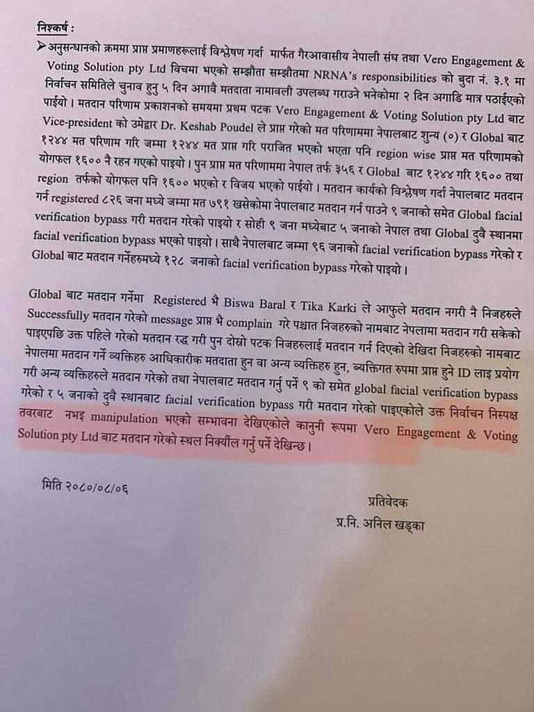 सीआईबीको अनुसन्धान प्रतिवेदनको निष्कर्ष खण्डमा भनिएको छ, ‘ग्लोबल बाट मतदान गर्नेमा रजिस्टर्ड भई विश्व बराल र टीका कार्कीले आफूले मतदान नगरी नै निजहरूले सक्सेसफुल्ली मतदान गरेको म्यासेज प्राप्त भई कम्प्लेन गरे पश्चात् निजहरूको नामबाट नेपालमा मतदान गरी सकेको पाइएपछि उक्त पहिले गरेको मतदान रद्द गरी पुनः दोस्रो पटक निजहरूलाई मतदान गर्न दिएको देखिँदा निजहरूको नामबाट नेपालमा मतदान गर्ने व्यक्तिहरू आधिकारिक मतदाता हुन् वा अन्य व्यक्तिहरू हुन्, व्यक्तिगत रूपमा प्राप्त हुने आइडीलाई प्रयोग गरी अन्य व्यक्तिहरूले मतदान गरेको तथा नेपालबाट मतदान गर्नुपर्ने ९ को समेत ग्लोबल फेसियल भेरिफिकेसन बाइपास गरेको र ५ जनाको दुवै स्थानबाट फेसियल भेरिफिकेसन बाइपास गरी मतदान गरेको पाइएकोले उक्त निर्वाचन निष्पक्ष तवरबाट नभई मेनुप्युलेसन (हेरफेर) भएको सम्भावना देखिएकोले कानुनी रूपमा भेरो इन्गेजमेन्ट एन्ड भोटिङ सोलुसन बाट मतदान गरेको स्थल निर्क्योल गर्नुपर्ने देखिन्छ ।’