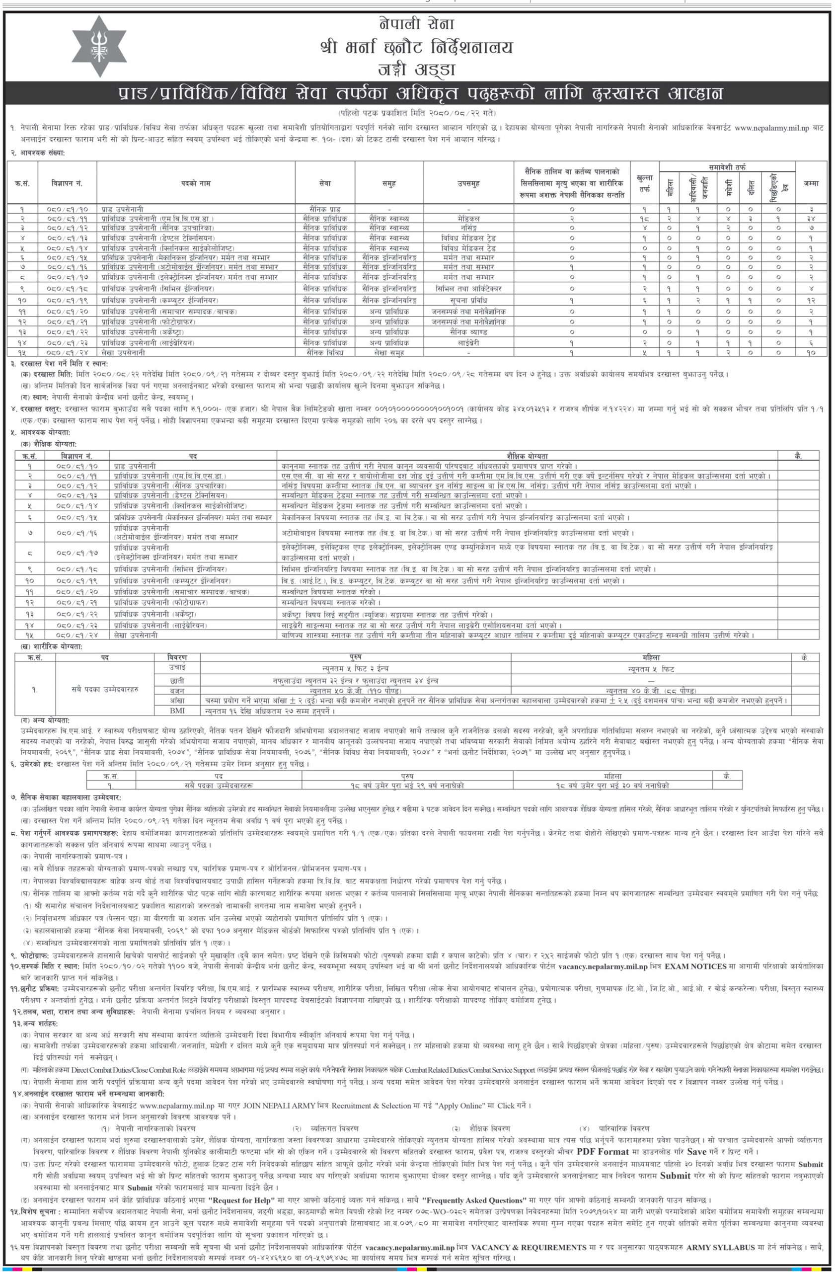 प्राड उपसेनानी, एमबीबीएस डाक्टर, सैनिक परिचारिका, डेन्टल टेक्निसियन, क्लिनिकल साइकोलोजिस्ट लगायत पदमा भर्ना खुलेको छ । यसैगरी मेकानिकल इन्जिनियर, अटोमोबाइल इन्जिनियर, इलेक्ट्रोनिक्स इन्जिनियर, सिभिल इन्जिनियर र कम्प्युटर इन्जिनियर पदमा पनि भर्ना खुलेको छ ।