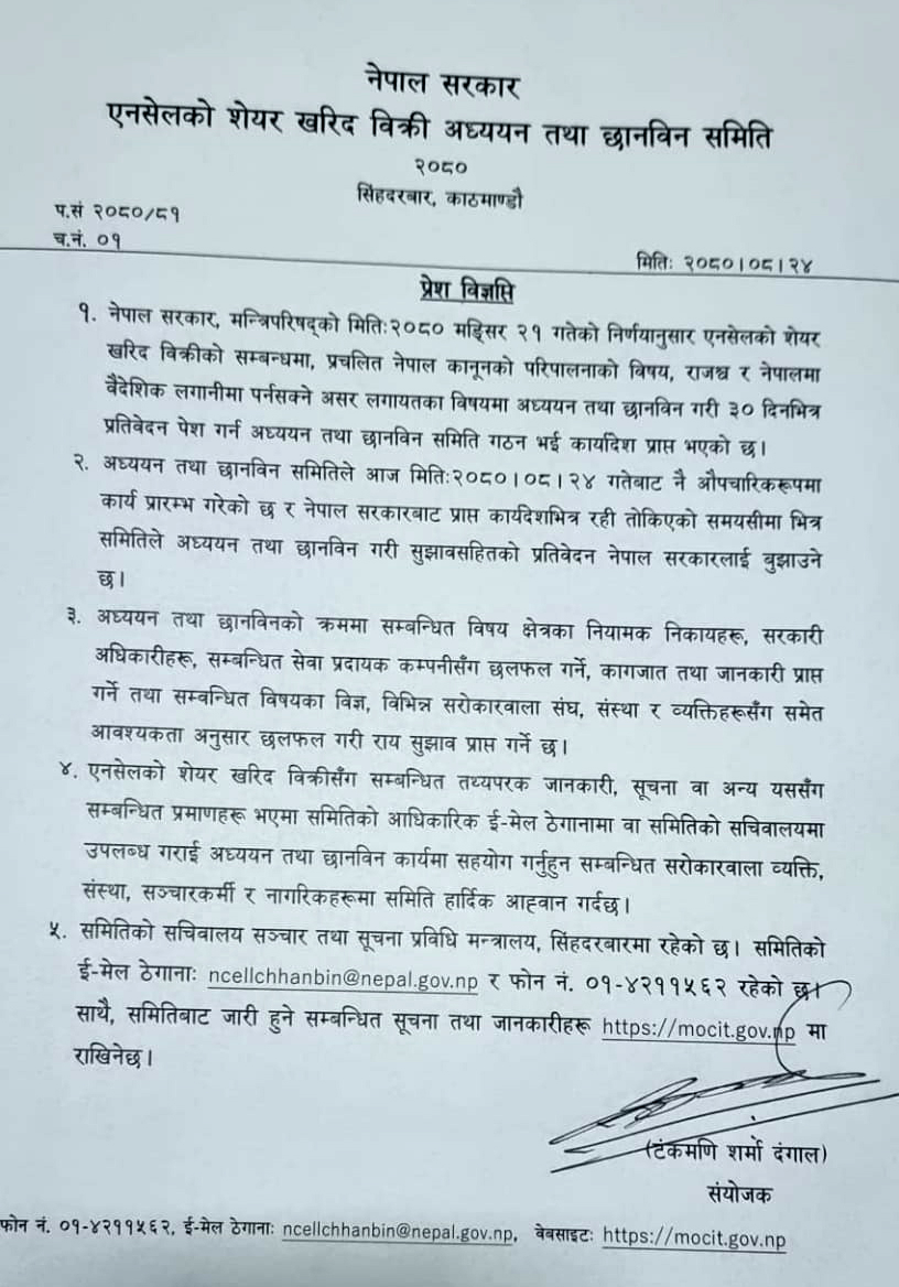काठमाडौं— दूरसञ्चार सेवा प्रदायक कम्पनी एनसेलको विदेशमा भएको शेयर खरिदबिक्री प्रकरणको छानबिन गर्नका लागि सरकारले गठन गरेको समितिले काम थालेको छ ।