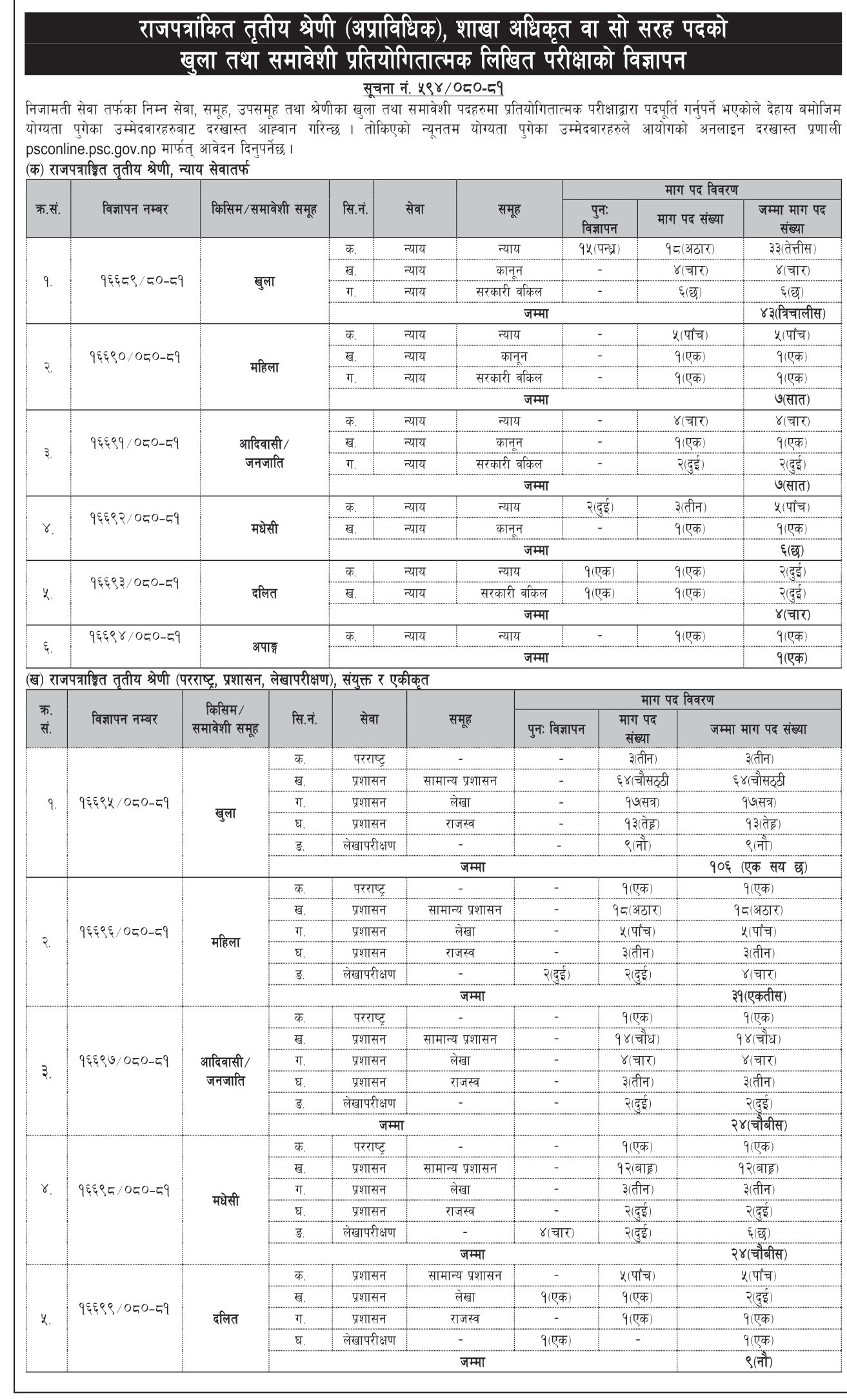 बुधबार सूचना प्रकाशित गरी आयोगले न्याय सेवा, परराष्ट्र सेवा र मानवअधिकार सेवातर्फ खुला तथा समावेशी पद्धतिबाट पदपूर्ति गर्नुपर्ने भएकाले इच्छुक तथा योग्यता पुगेका नेपाली नागरिकहरूबाट आवेदन मागेको हो ।