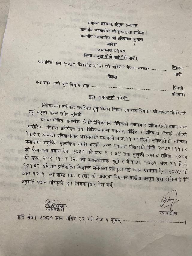 काठमाडौं— नाबालिग बलात्कारको अभियोग लागेका अभिनेता पूर्णविक्रम शाह (पल शाह) लाई सफाइ दिने उच्च अदालत पोखराको फैसला सर्वोच्च अदालतले दोहोर्याएर हेर्ने भएको छ ।