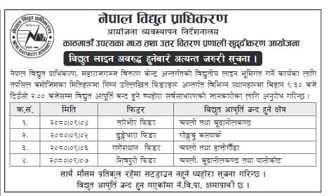 नेपाल विद्युत प्राधिकरणका अनुसार आज बुधबार चपली तथा बूढानीलकण्ठ, बिहीबार गोङ्गबु बसपार्क, शुक्रबार चपली तथा हात्तीगौँडा र शनिबार चपली, बूढानीलकण्ठ तथा पासीकोटमा आपूर्ति बन्द हुनेछ ।