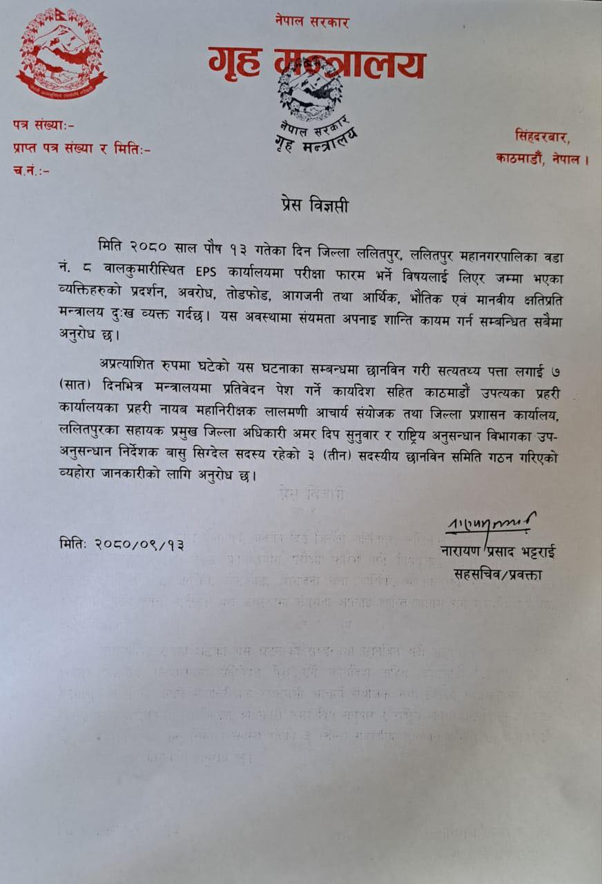 रोजगार अनुमति प्रणाली (ईपीएस) परीक्षा दिन नपाएपछि प्रदर्शन गरेका युवाहरूले मन्त्रीको गाडीमा आगजनी गरेपछि झडप भएको थियो भने प्रहरीले अश्रुग्यास हानेको थियो । त्यसक्रममा दुई जनाको मृत्यु भएको छ भने केही पक्राउ परेका छन् ।