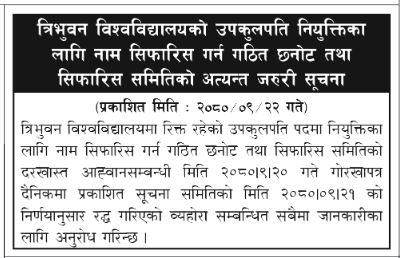काठमाडौं— शिक्षा, विज्ञान तथा प्रविधि मन्त्रालयले त्रिभुवन विश्वविद्यालयको उपकुलपति नियुक्तिका लागि दरखास्त आह्वान गर्दै गरेको विज्ञापन रद्द गरेको छ ।