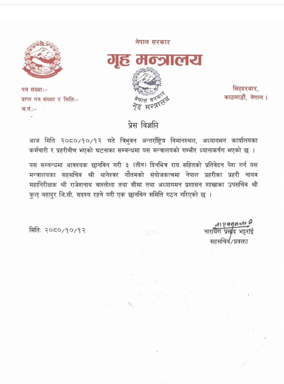 काठमाडौं— त्रिभुवन अन्तराष्ट्रिय विमानस्थल, अध्यागमन कार्यालयमा अध्यागमनका कर्मचारीलाई प्रहरीले कुटेको बारेमा छानबिन गर्न गृह मन्त्रालयले छानबिन समिति गठन गरेको छ ।