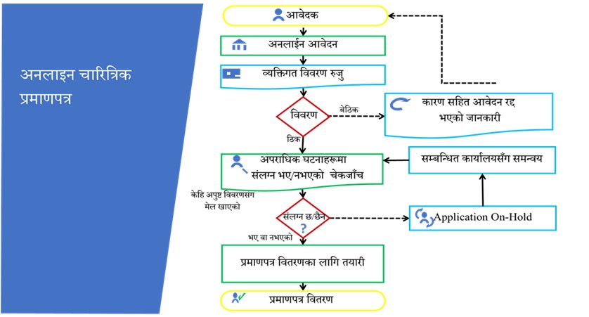 तीमध्ये १ लाख ४४ हजार २१२ वटा आवेदन रद्द भएका थिए भने १६ हजार ६ सय ७२ आवेदन कार्यान्वयनको क्रममा रहेका छन् । विभिन्न प्रयोजनका लागि चारित्रिक प्रमाणपत्र लिनका लागि अनलाइन निवेदन दिने स्वदेशी तथा विदेशी नागरिकहरूलाई नेपाल प्रहरीले चारित्रिक प्रमाणपत्र उपलब्ध गराउने गरेको छ ।