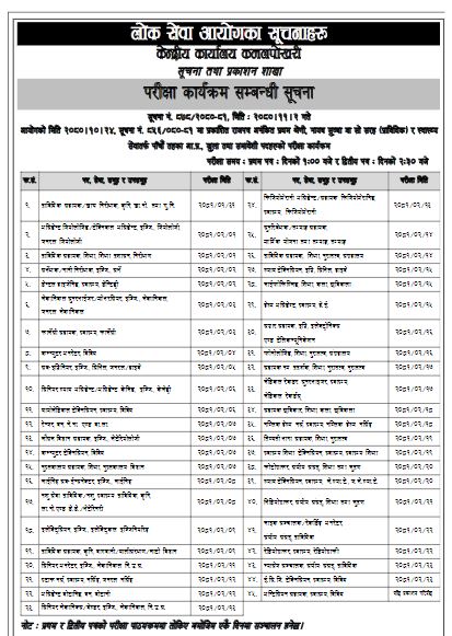 आयोगले २०८० माघ २४ गते जारी गरेको सूचना अनुसार राजपत्र अनंकित प्रथम श्रेणी, नायब सुब्बा वा सो सरहको प्राविधिक र स्वास्थ्य सेवा तर्कको खुला तथा समावेशी परीक्षा आगामी वैशाख ३१ देखि सञ्चालन हुने भएको हो।