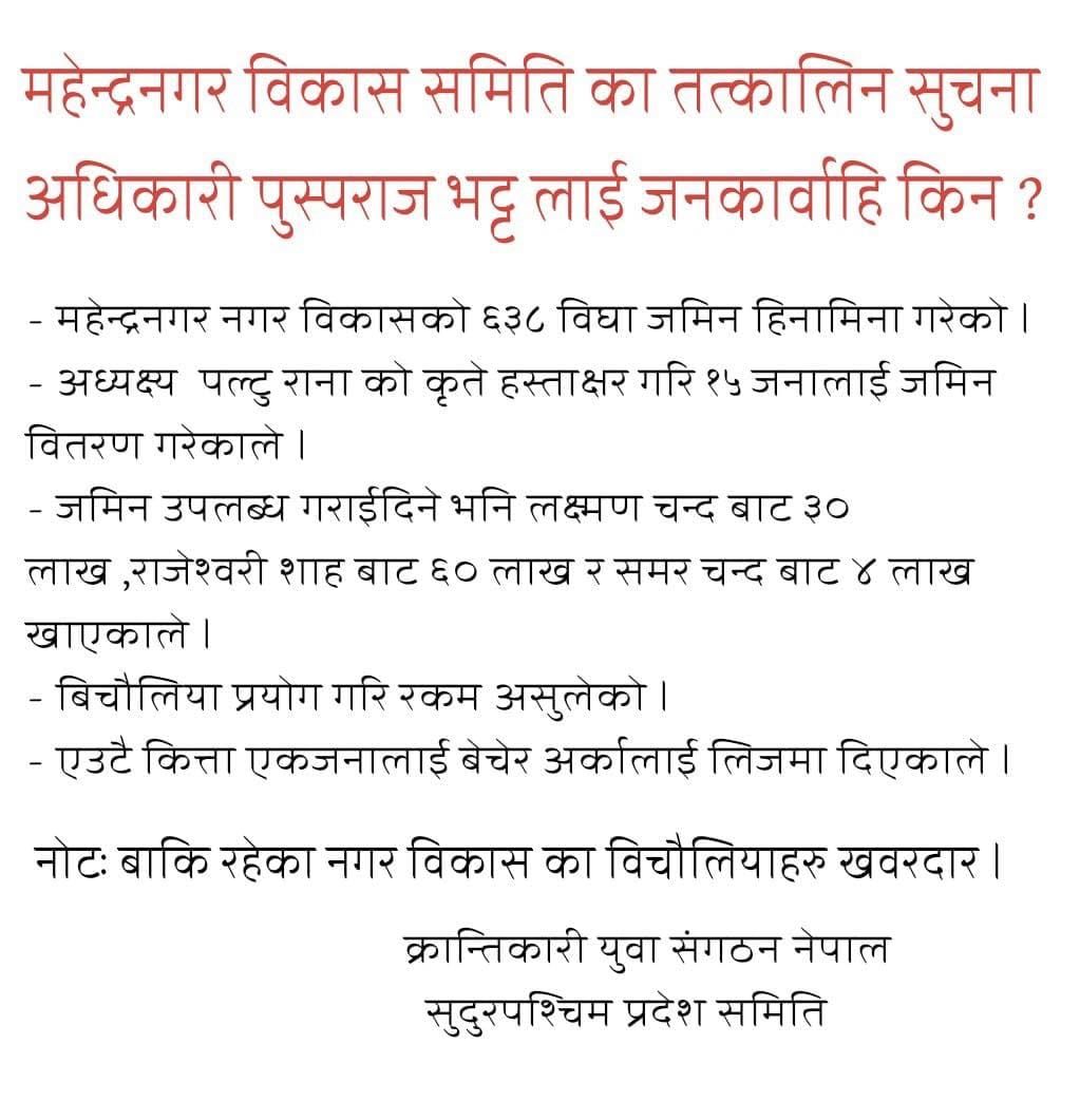 कञ्चनपुर– महेन्द्रनगर विकास समितिका तत्कालीन सूचना अधिकारी पुष्पराज भट्टमाथि दुर्व्यवहार भएको छ।