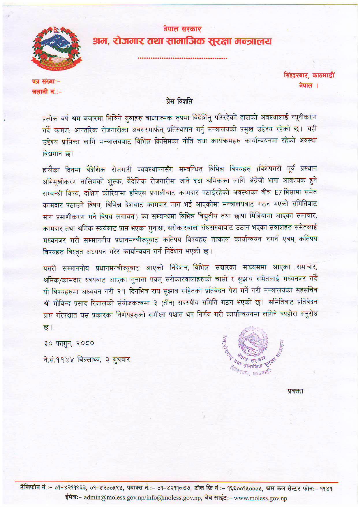 पूर्व प्रस्थान अभिमुखीकरण तालिमको शुल्क, वैदेशिक रोजगारीमा जाने दक्ष श्रमिकका लागि अङ्ग्रेजी भाषा आवश्यक हुने सम्बन्धी विषय, दक्षिण कोरियामा इपिएस प्रणालीबाट कामदार पठाइरहेको अवस्थाकाबीच इ-सेभन भिसामासमेत कामदार पठाउने लगायतका विषयमा विवाद देखिएपछि २१ दिनभित्र राय सुझावसहितको प्रतिवेदन पेश गर्ने गरी मन्त्रालयले समिति गठन गरेको हो।