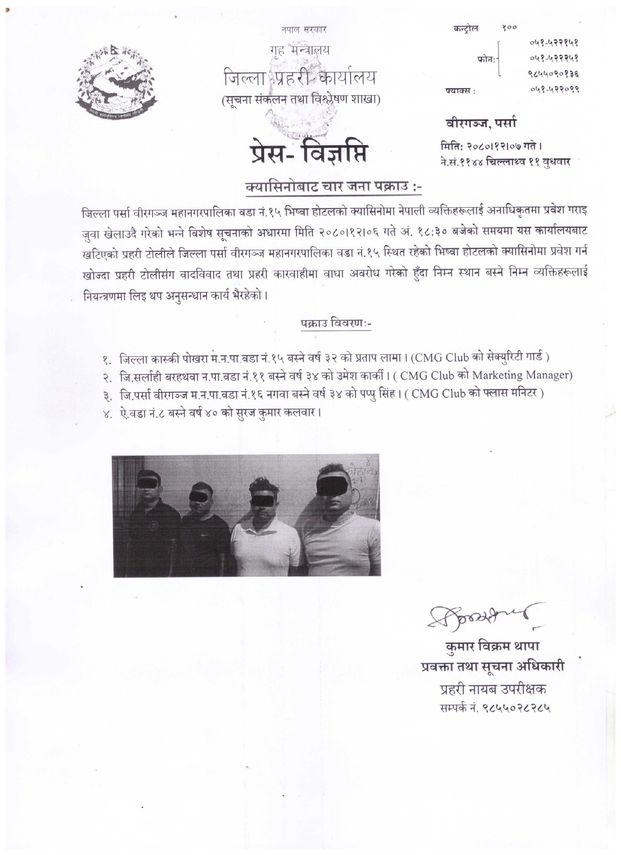 वीरगञ्ज महानगरपालिका–१५ भिश्वा होटलको सीएमजी क्लब क्यासिनोबाट चार नेपालीलाई जिल्ला प्रहरी कार्यालय पर्साको टोलीले पक्राउ गरेको हो।