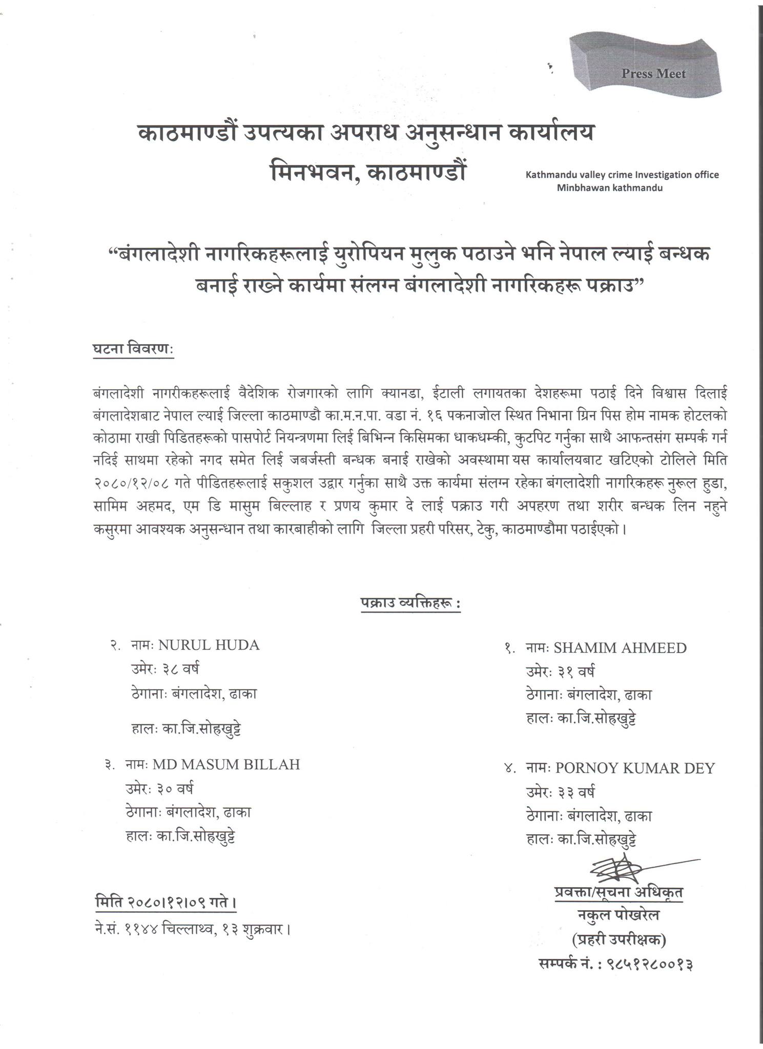 उनका अनुसार बङ्गलादेशी नागरिक नुरूल हुडा, सामिम अहमद, एमडी मासुम बिल्लाह र प्रणय कुमारलाई पक्राउ गरिएको छ। उनीहरूले नै बन्धक बनाएका हुन्।