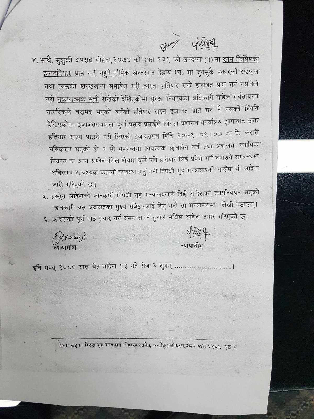 अदालतजस्तो संवेदनशील क्षेत्रमा त्यस्ता हतियार बोक्न नपाउने गरी कानुनको व्यवस्था अविलम्ब मिलाउनसमेत गृहको नाममा आदेश भएको हो ।