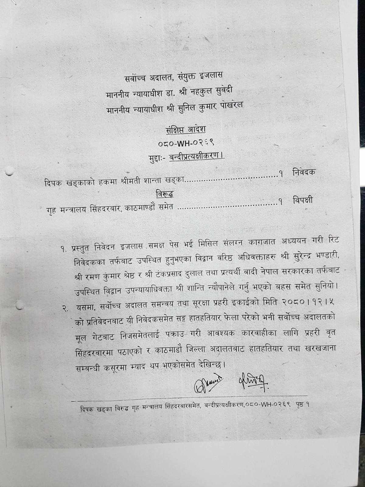 सर्वोच्चका न्यायाधीश नहकुल सुवेदी र सुनिलकुमार पोखरेलको संयुक्त इजलासले मंगलबार गृह मन्त्रालयको नाममा यस्तो आदेश दिएको हो।