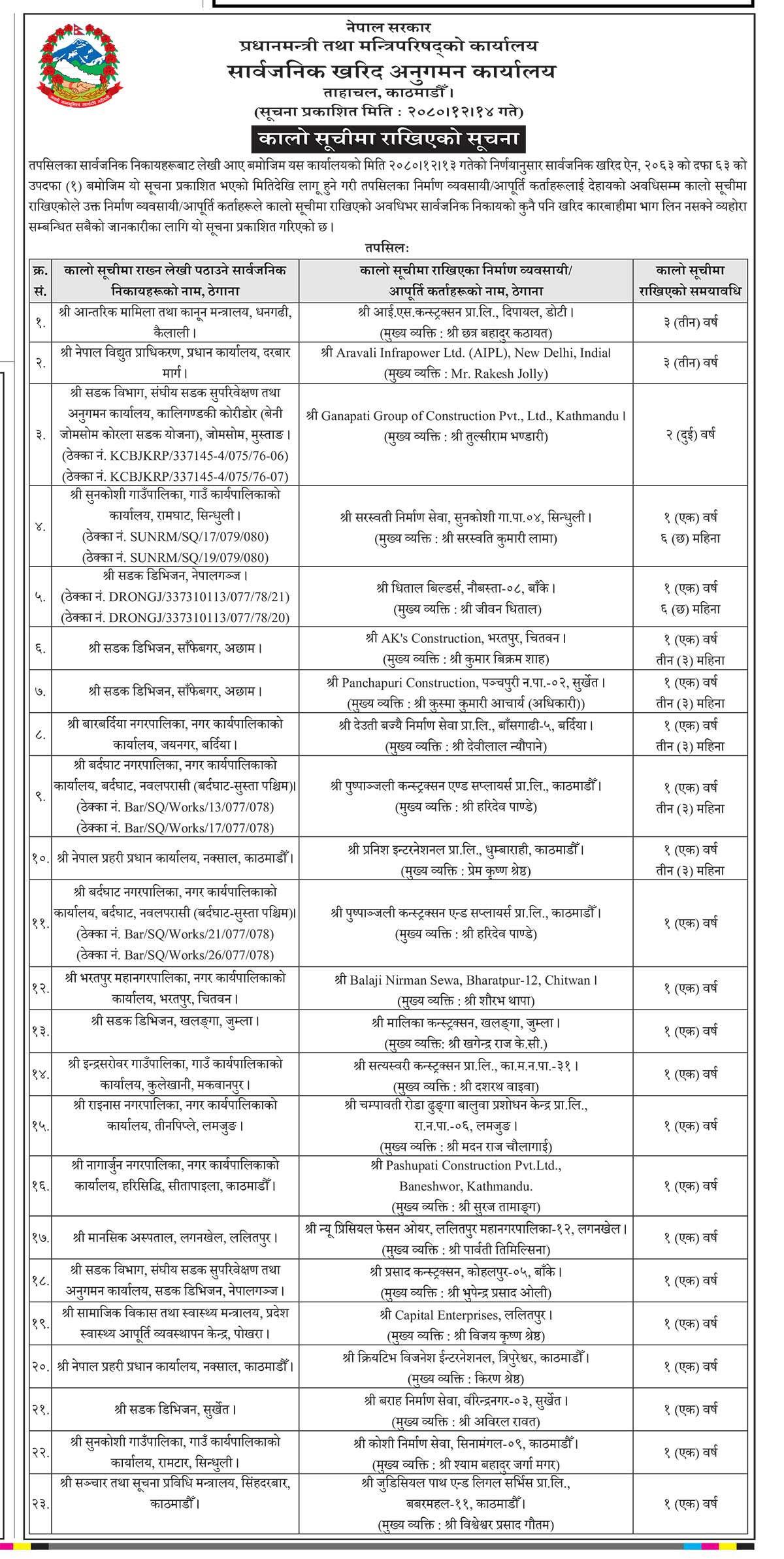 खरिद अनुगमन कार्यालयले एक सार्वजनिक सूचना जारी गर्दै २३ कम्पनीलाई एकदेखि तीन वर्षसम्म कालो सूचीमा राखेको उल्लेख गरेको छ।
