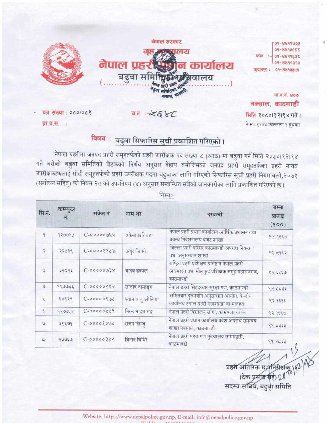डीएसपीहरु ढकेन्द्र खतिवडा, अंगुर जिसी, यादव ढकाल, सन्तोष तामाङ, श्याम बाबु ओलिया, निरञ्जन दत्त भट्ट, राजन लिम्बू र विनोद घिमिरेलाई एसपीमा बढुवा गर्न सिफारिस गरिएको छ।