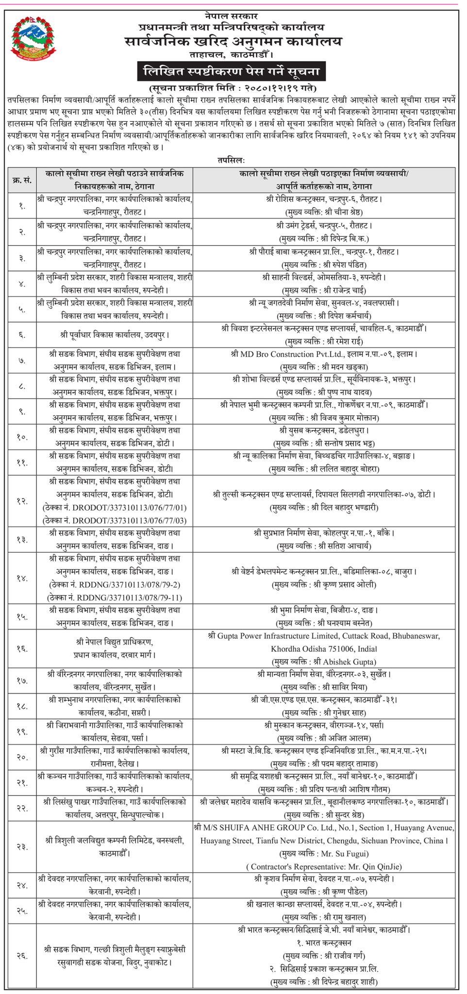 प्रधानमन्त्री तथा मन्त्रिपरिषद कार्यालय मातहतको सार्वजनिक खरिद अनुगमन कार्यालयले सोमबार सार्वजनिक सूचना निकालेर कार्यसम्पादन सन्तोषजनक नभएका तीन विदेशीसहित २७ वटा निर्माण कम्पनीहरूलाई कारबाही गर्नु नपर्ने कारणसहित सात दिनभित्र लिखित जवाफ पेश गर्न अल्टिमेटम दिएको छ।