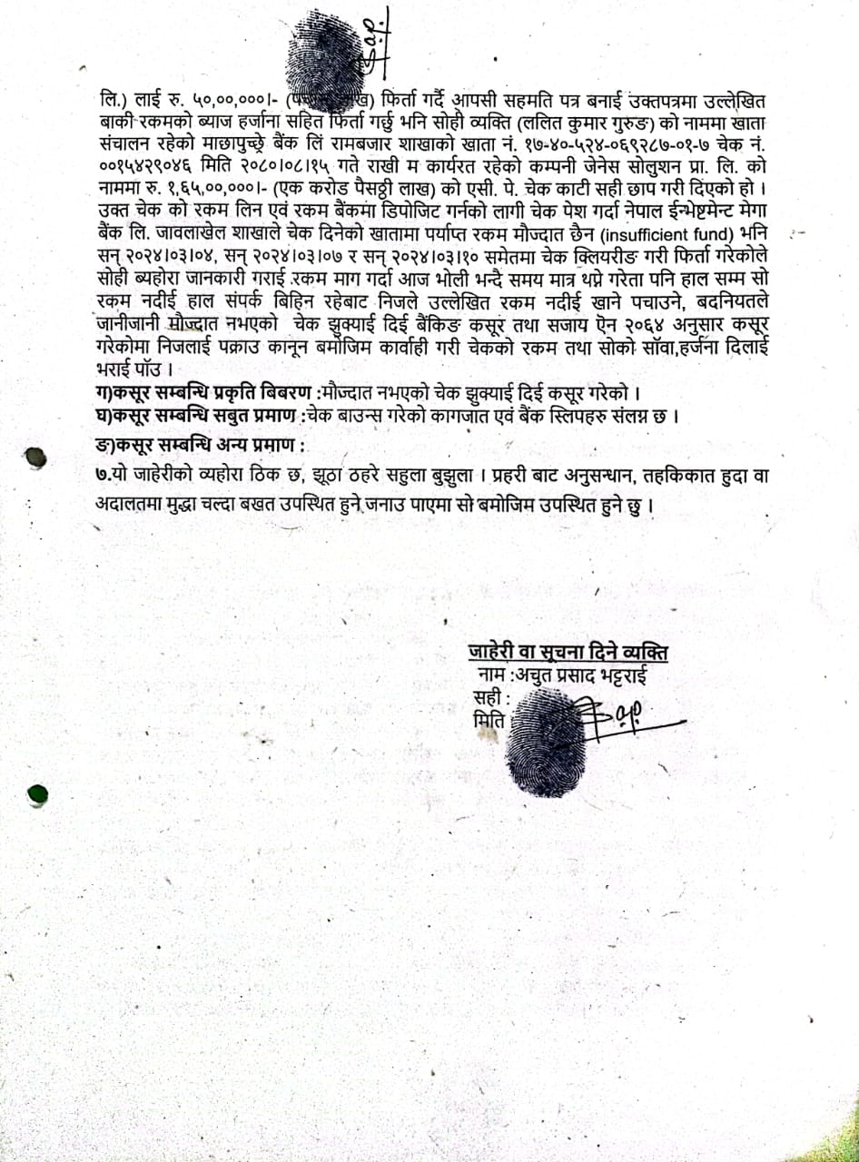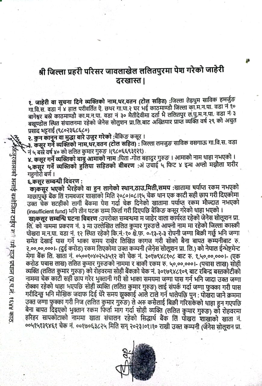 नेपाल इन्भेष्टमेन्ट मेगा बैंक लिमिटेडको जावलाखेल शाखामा उक्त चेक साट्न पटकपटक जाँदा बैंकले गुरुङको खातामा पर्याप्त रकम नरहेको जानकारी दिएको थियो। त्यसपछि कम्पनीले गुरुङविरुद्ध उजुरी दिएको हो।
