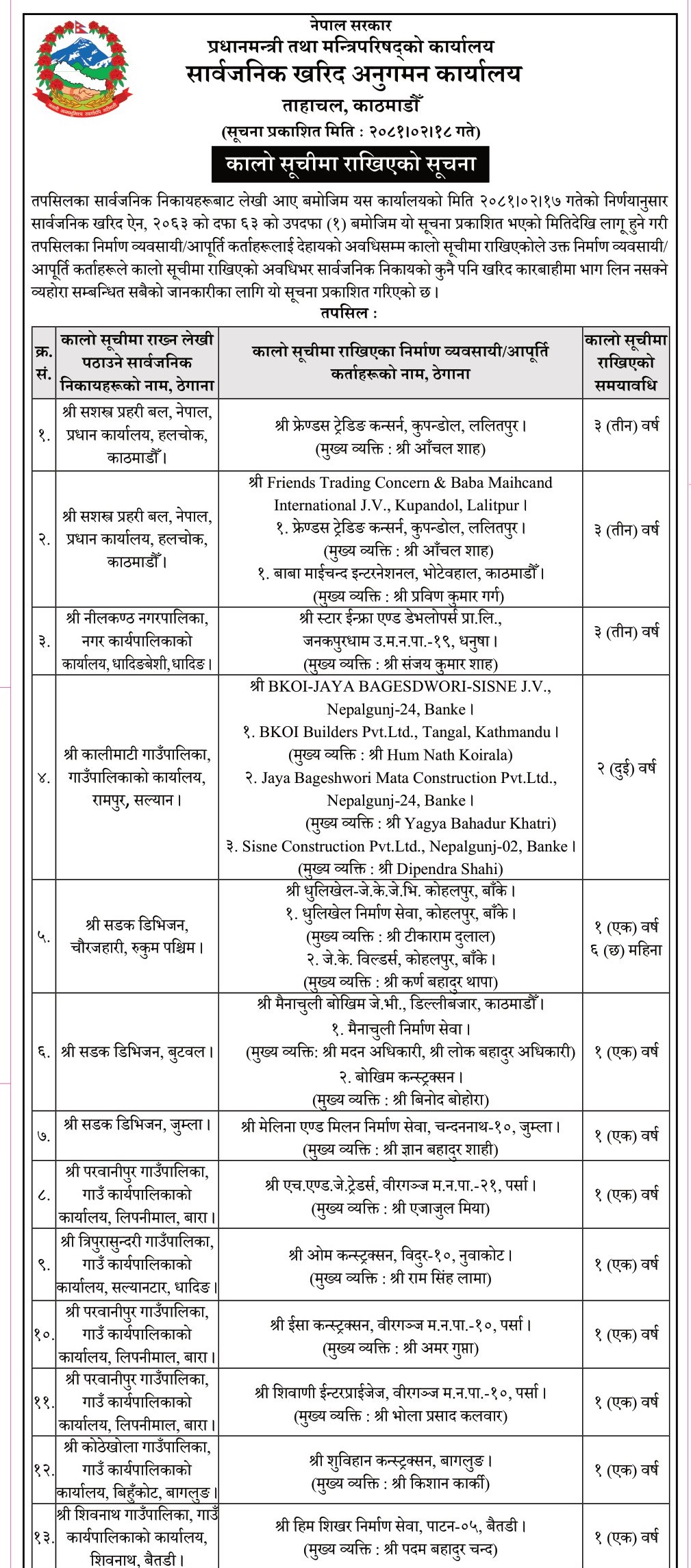त्यसैगरी सडक डिभिजन बुटवलको सिफारिसमा २ कम्पनीलाई कालोसूचीमा राखिएको कार्यालयले जनाएको छ। मैनाचुली निर्माण सेवा र बोखिम कन्स्ट्रक्सनलाई १ वर्षका लागि कालोसूचीमा राखिएको हो।