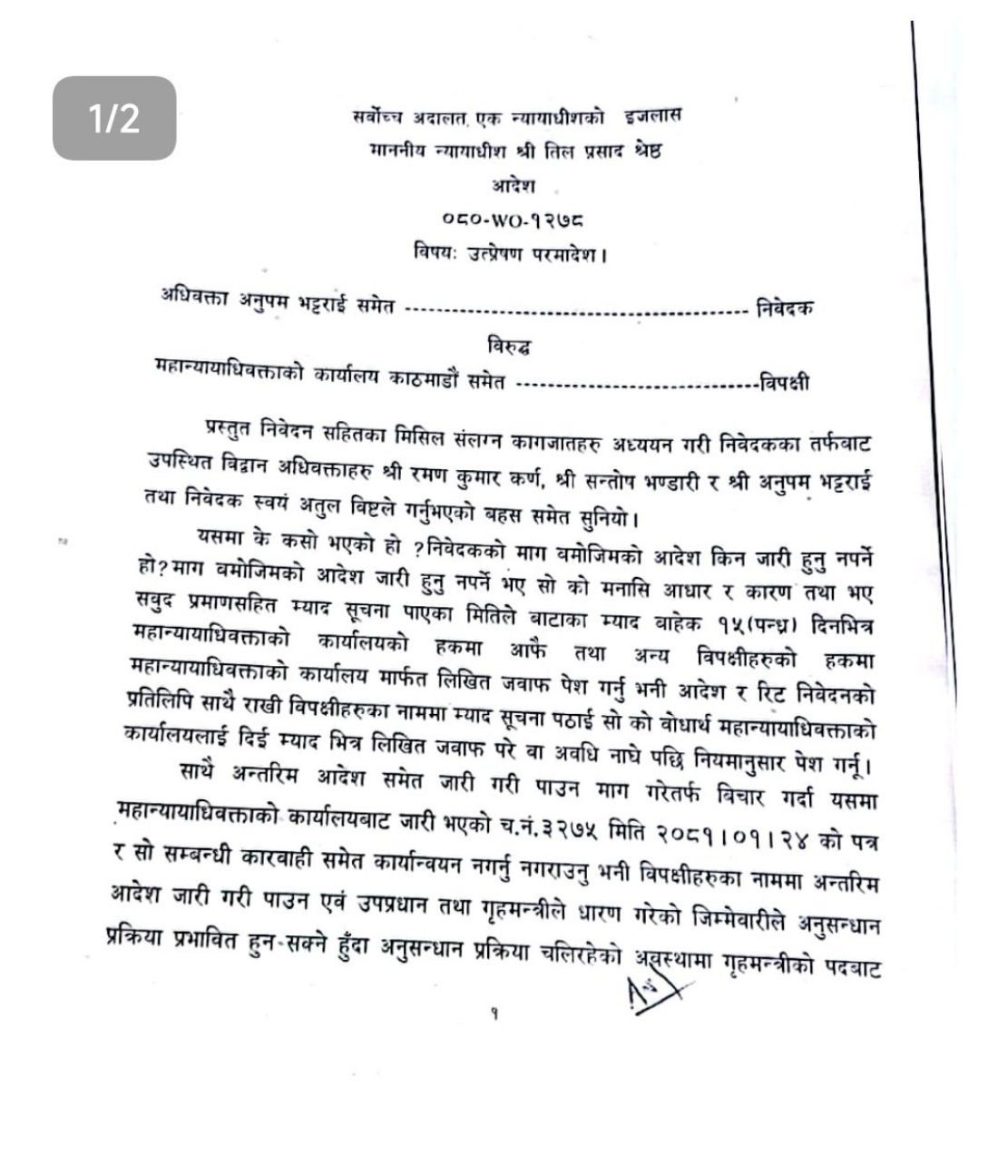 अधिवक्ता अनुपम भट्टराईले दायर गरेको रिटमाथि प्रारम्भिक सुनुवाइ गर्दै अन्तरिम आदेशका लागि दुवै जनालाई उपस्थित हुन भनिएको छ।