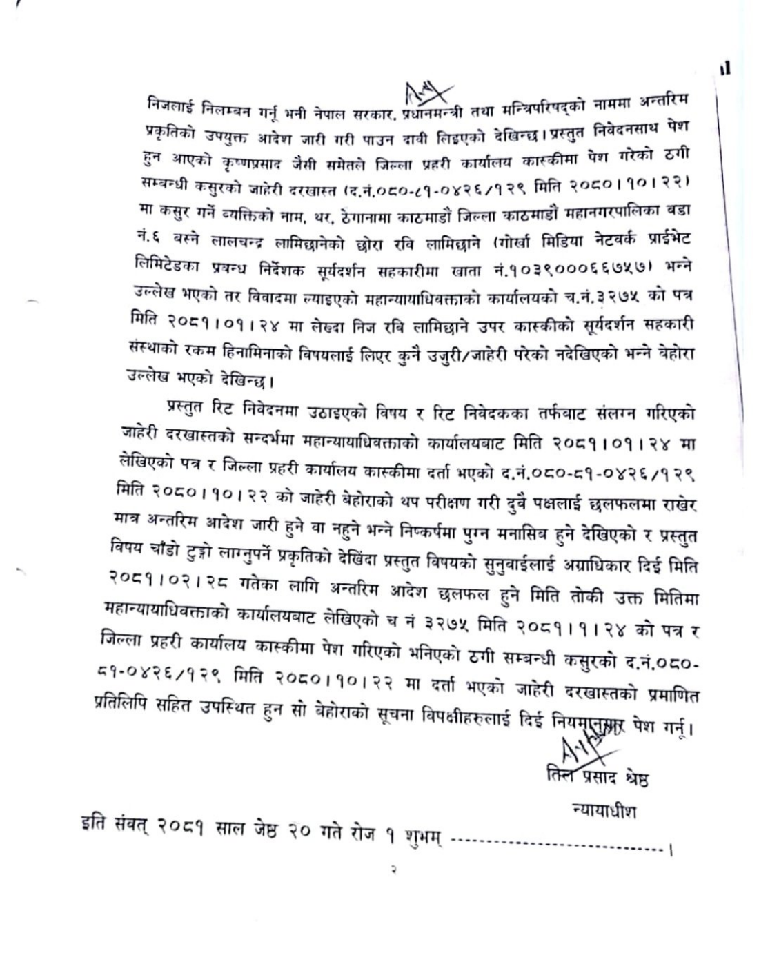 सर्वोच्चले अन्तरिम आदेश जारी गर्ने विषयमा दुवै पक्षबीच छलफल हुनुपर्ने र यो विवाद तत्काल निष्कर्षमा पुग्नुपर्ने भन्दै जेठ २८ गतेका लागि पेसी समेत तोकिएको छ। त्यस्तै गृहमन्त्री लामिछानेलार्ई सहकारी ठगी प्रकरणमा कुनै पनि उजुरी नपरेको भन्ने महान्यायाधिवक्ता कार्यालयको पत्र र गृहमन्त्री लामिछानेविरुद्ध कास्की प्रहरीमा परेको भनिएको उजुरीको प्रतिलिपि झिकाउन समेत आदेश दिइएको छ।
