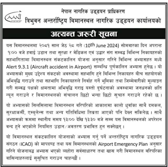 दिउँसो १ बजेबाट साढे १ बजेसम्म हवाई उडान तथा सुरक्षा र मेडिकल एवं उद्धारसँग सम्बद्ध विभिन्न निकायहरूको सहभागितामा विमानस्थल सङ्कटकालीन योजना अनुसार गरिने विभिन्न अभ्यासहरू मध्ये Alert 9.3.1(विमानस्थलमा विमान दुर्घटना) सम्बन्धी पूर्णकालीन अभ्यास हुने कार्यालयले जनाएको छ।