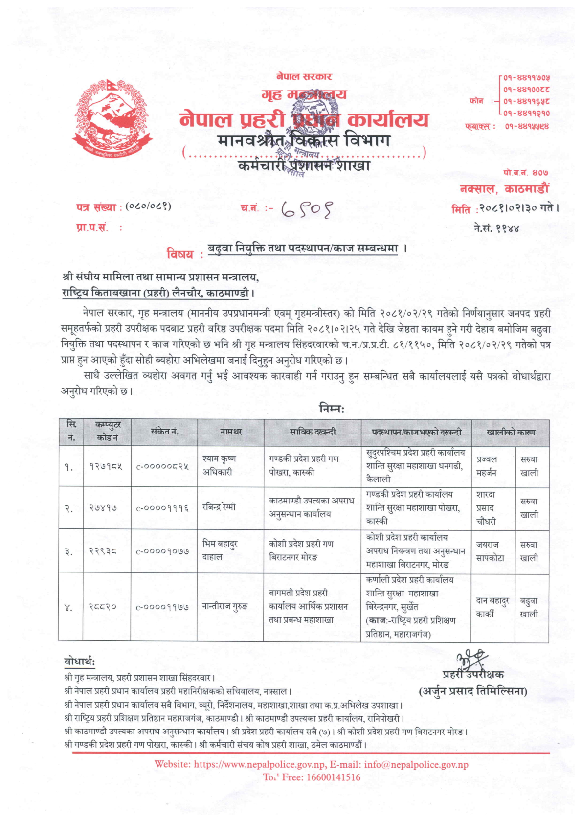 अधिकारीको सुदूरपश्चिम प्रदेश प्रहरी कार्यालयअन्तर्गत शान्ति सुरक्षा महाशाखा र रेग्मीको गण्डकी प्रदेश प्रहरी कार्यालयअन्तर्गत शान्ति सुरक्षा महाशाखामा पदस्थापन गरिएको छ।