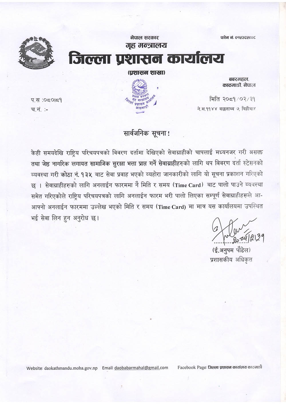 राष्ट्रिय परिचय पत्रका लागि टाइम कार्डअनुसार आउन काठमाडौं प्रशासनको आग्रह