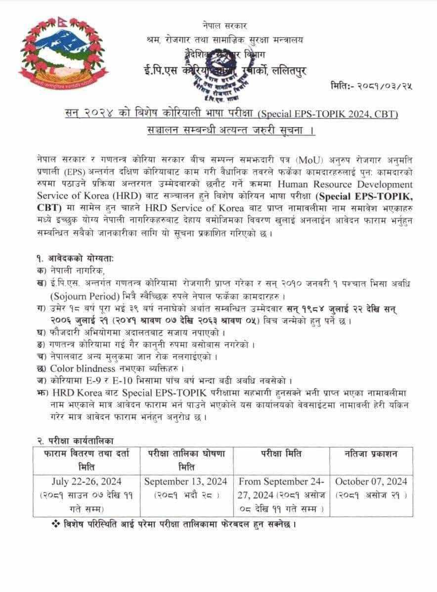 ईपीएस कोरिया शाखाले मङ्गलबार सन् २०२४ को विशेष कोरियाली भाषा परीक्षा सञ्चालन सम्बन्धी सूचना प्रकाशित गरेको हो।