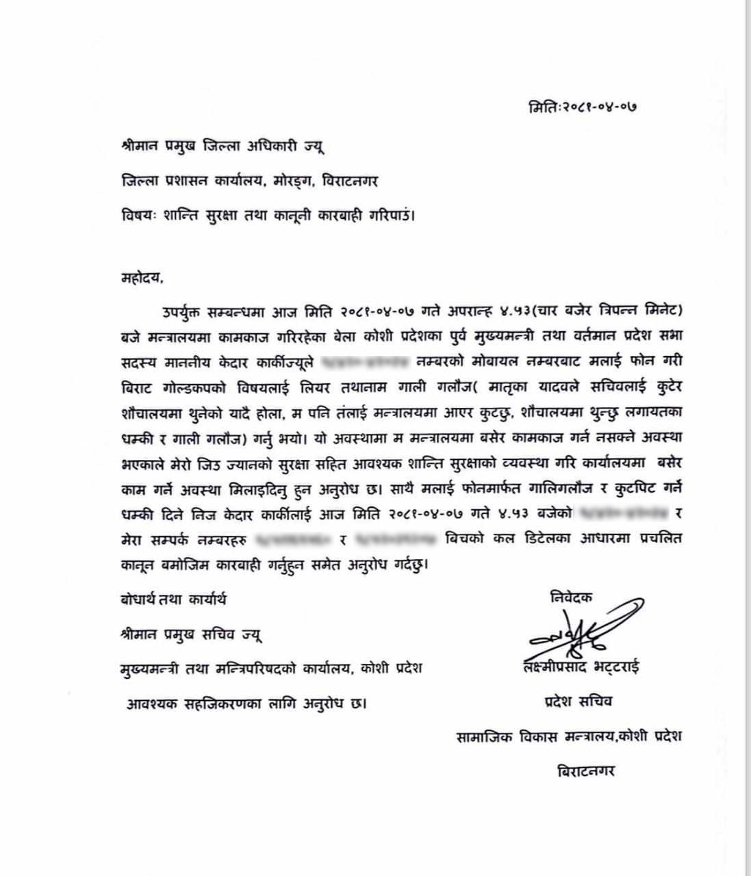 प्रदेश सचिव भट्टराईले टेलिफोनबाट शौचालयमा थुनेर कुट्ने धम्की दिएको भन्दै जिल्ला प्रशासन कार्यालय मोरङमा निवेदन दिएको मोरङका प्रमुख जिल्ला अधिकारी प्रेम प्रसाद भट्टराईले जानकारी दिए।