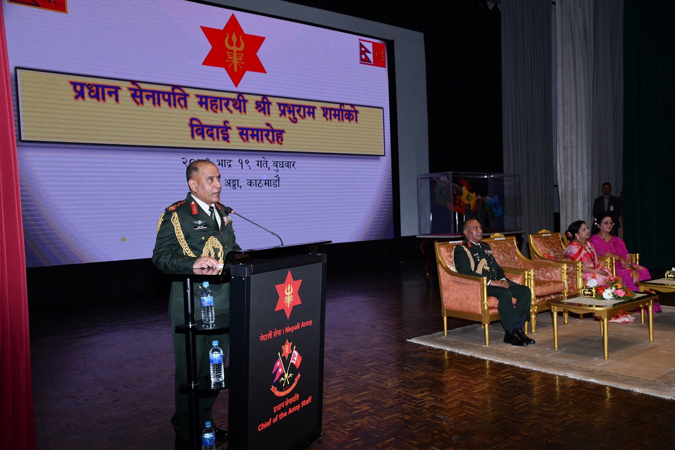 काठमाडौं— अवकाशमा जान लागेका प्रधानसेनापति प्रभुराम शर्मालाई नेपाली सेनाले बिदाइ गरेको छ। करिब ४२ वर्ष लामो सैनिक सेवा एवं प्रधान सेनापतिको तीन वर्षे कार्यकाल सम्पन्न गरी भदौ २४ गतेबाट अवकाश प्राप्त गर्न लागेका शर्माको सम्मानमा आज जङ्गी अड्डामा एक कार्यक्रम गरी बिदाइ गरिएको हो।